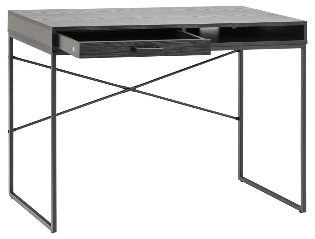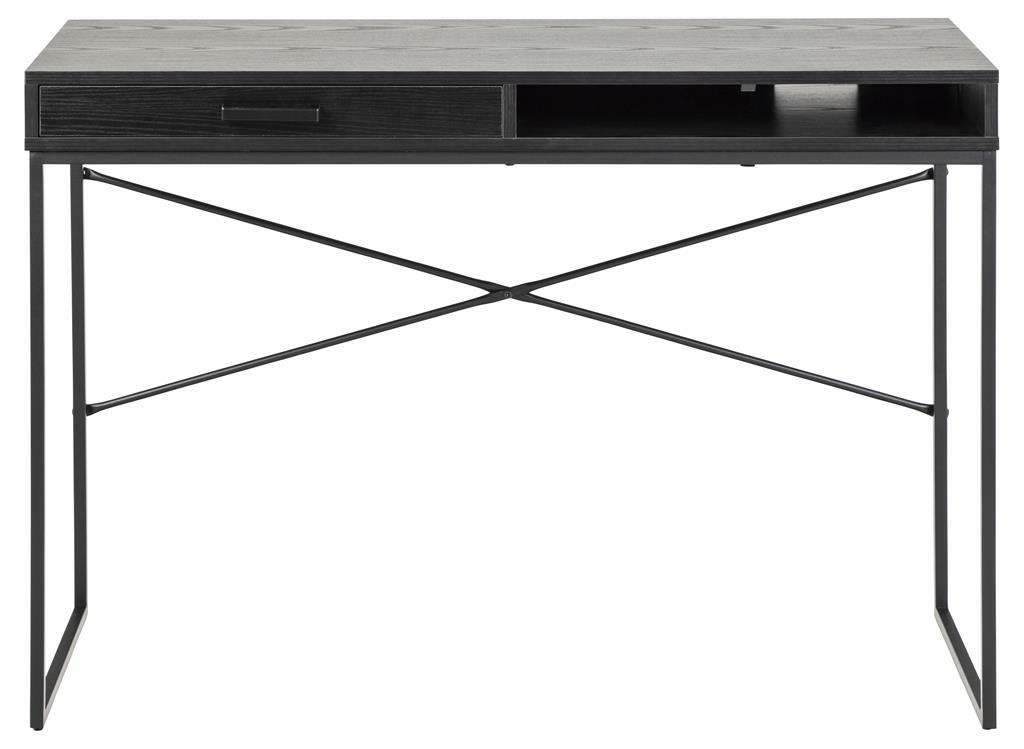 Biurko Seaford z szufladą to mebel w stylu minimalistycznym idealny do pokoju młodzieżowego lub domowego biura. Jego podstawa wykonana jest z malowanego proszkowo metalu w kolorze czarnym. Blat stanowi płyta MDF również w kolorze czarnym. Ten model biurka posiada pod blatem szufladę z metalowym uchwytem, a także dodatkowy schowek. Cechą charakterystyczną są dwa krzyżujące się metalowe elementy z tyłu biurka. Biurko Seaford z szufladą sprawdzi się świetnie przy odrabianiu lekcji, pracy przy komputerze czy wypełnianiu dokumentów. Ilosć kartonów: 1 Wymiary kartonów: 120×55,5x17cm Waga kartonów: 19kg
