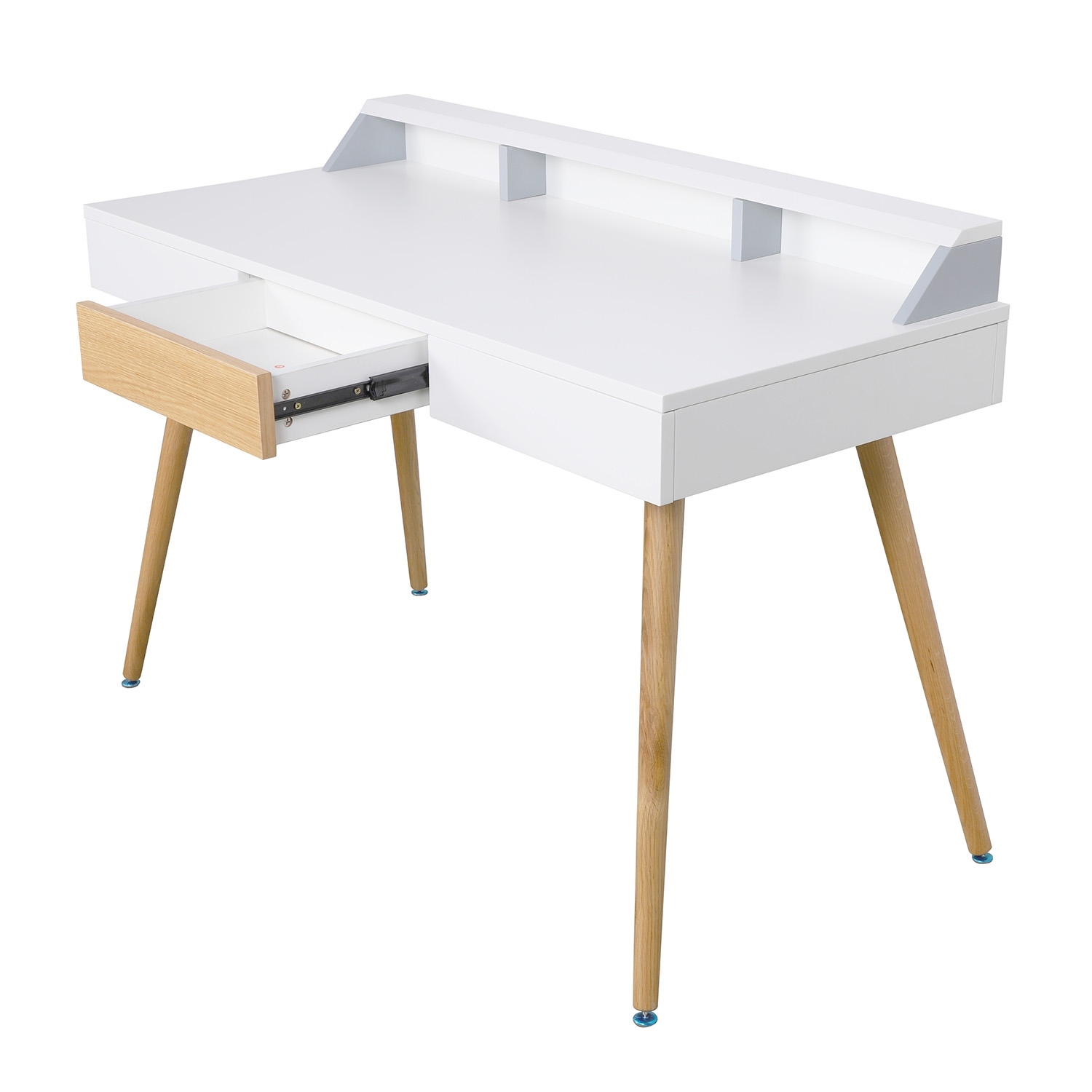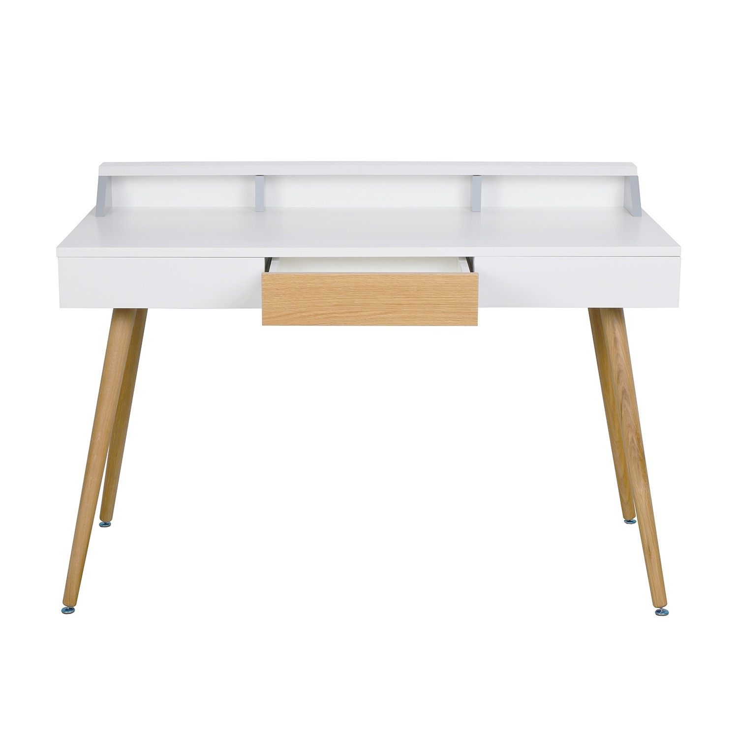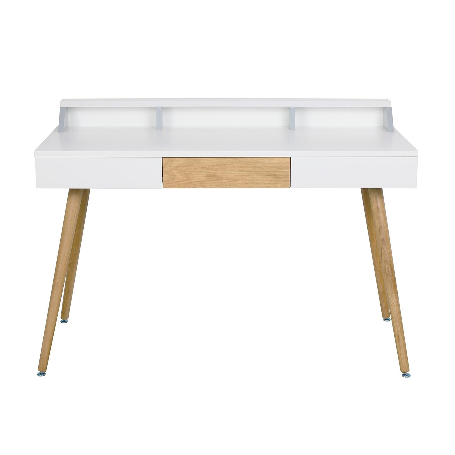 Biurko Skans to miejsce do pracy nie tylko w biurze, ale również w domowym zaciszu. Biurko z białym blatem i drewnianymi nogami oprócz swojej roli roboczego blatu będzie również ozdobą domowego biura. Podstawą biurka są cztery bukowe, polakierowane nogi, które delikatnie rozchodzą się na boki, nawiązując do stylu vintage. Biały szeroki blat zrobiony został z laminowanej płyty MDF, dzięki czemu jest niezwykle wytrzymały. Biurko posiada niskie ścianki o wysokości 9,5cm, które tworzą swoiste miejsce do segregowania biurowych akcesoriów. Ścianki pomagają utrzymać porządek na biurku. Ciekawym kontrastowym elementem biurka jest szuflada z frontem o wysokości 11 cm w okleinie imitującej naturalne drewno. Szuflada dzięki zastosowaniu wysokiej jakości szyn otwiera się bardzo delikatnie.Wysokość ścianki: 9,5 cmGł. przegródek: 7 cm.Gł. wewnątrz szuflady: 23,5 cm Szer. wewnątrz szuflady: 35 cmSzer. przegródki środkowa: 45 cm, zewnętrzne: 31,5 cmRozstaw nóg: 125 cm