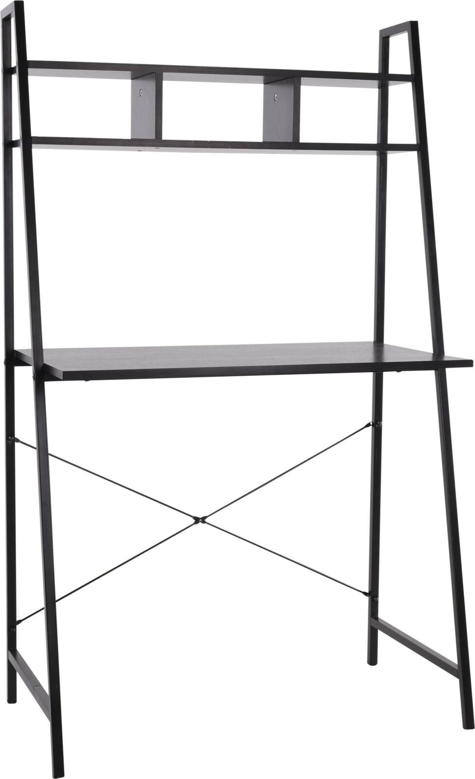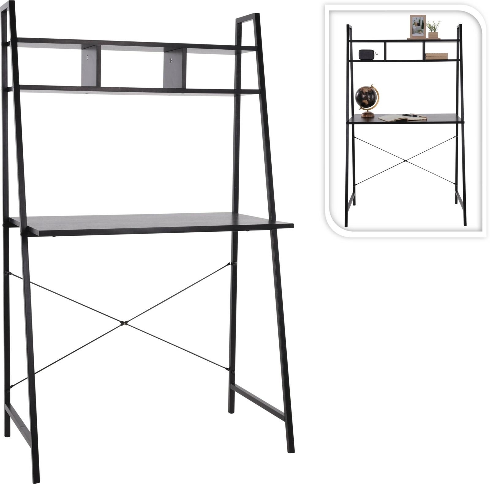 Czarne, minimalistyczne biurko z nadstawką to idealny mebel jako miejsce pracy dla ludzi pozostających na home office, jak i również ciekawe biurko dla uczniów do odrabiania prac domowych. Czarne biurko o metalowym, malowanym proszkowo szkielecie oraz blacie z płyty MDF w czarnym kolorze sprawdzi się w niedużych pokojach, gdzie ważna jest organizacja przestrzeni. Biurko posiada dwie półki, które pomieszczą przybory szkolne, długopisy, a na górnej półce nawet spore książki. Maksymalne obciążenie górnej półki 5kg. Biurko wymaga montażu. Wymiary opakowania: 47,5x65x144cm.
