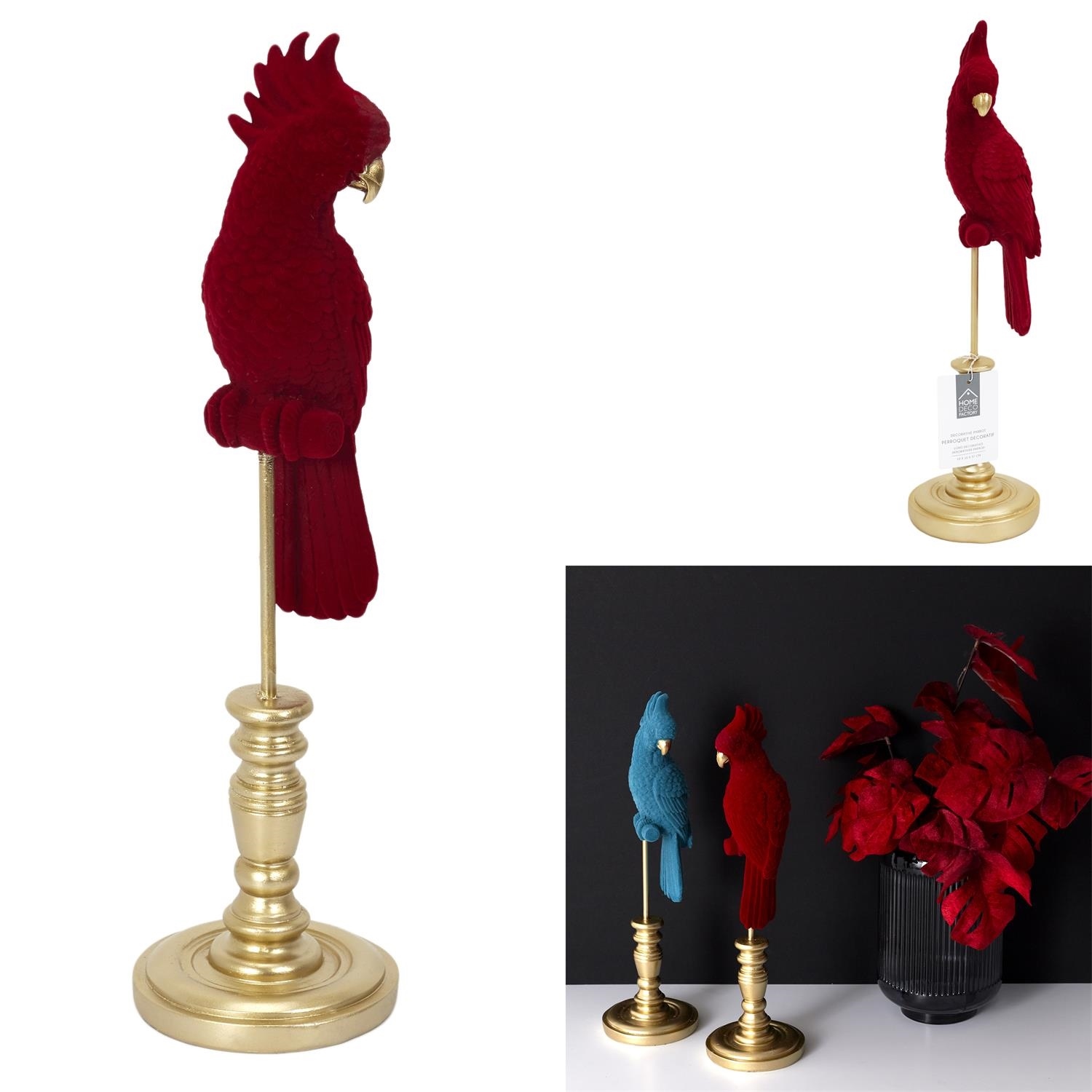 Urocza papuga z tworzywa doda egzotycznego akcentu we wnętrzu. Papuga na stojaku o zlotym kolorze wpisze się we wnętrze w stylu glamour. Tworzywo przypominające zamsz pokrywa figurkę dodając jej nietypowego wyglądu.