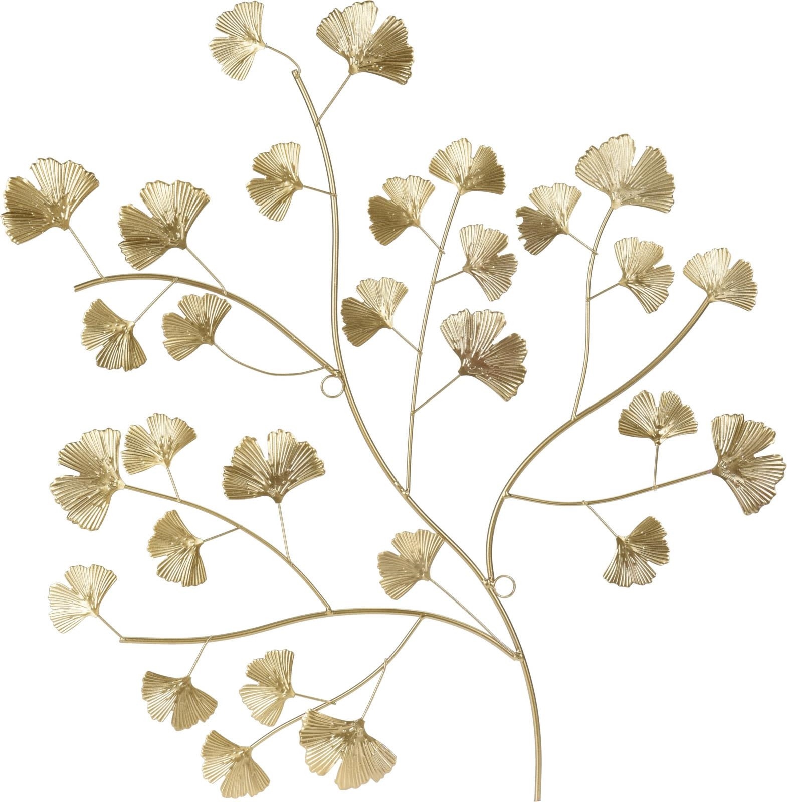 Metalowa dekoracja ścienna o kształcie roślinnym będzie idealnym dodatkiem do wnętrz modern glamour. Metalowa dekoracja została pomalowana proszkowo na złoty kolor. Dzięki metalowym kółką możemy dekoracje przymocować do ściany na kołki rozporowe (nie dostępne w zestawie). Wymiary opakowania: 55X1,5X58CM