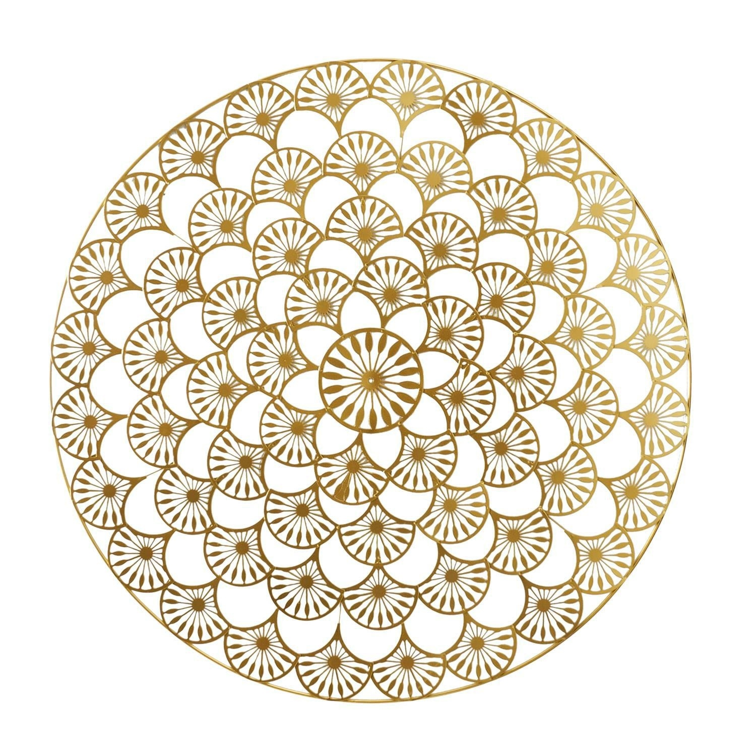 Metalowa dekoracja ścienna w kształcie mandali doda harmonii we wnętrzu i będzie jego wyjątkową ozdobą Okrągła, złota ozdoba o średnicy 70cm charakteryzuje się delikatnym, powtarzającym się wzorem, który dzięki ażurowej konstrukcji nie przytłacza. Lekka ozdoba sprawi, że zwykła pusta ściana nabierze charakteru.Waga: 1,25kgWymiary opakowania:15,5×72,5x73cm, Max 8 szt w kartonie