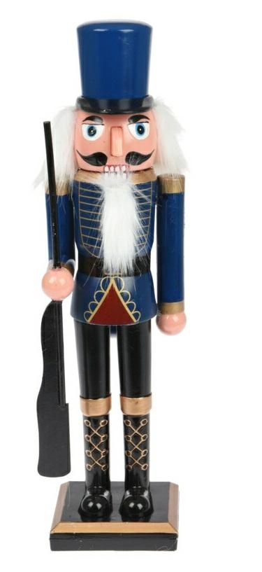 Dekoracja dziadek do orzechów w niebanalnym kolorze, głębokiego granatu to hit każdych świąt bożego narodzenia. Sympatyczny żołnierz o puchatych białych włosach skradnie serce domowników. Świąteczny dziadek do orzechów dopełni świąteczną aranżację. Duży, bo aż 28-centymetrowy, dziadek został zrobiony ze sztucznego tworzywa, dzięki czemu jest wytrzymalszy od jego drewnianych odpowiedników. Dziadek posiada okrągłą podstawkę, dzięki której stoi stabilnie, więc śmiało możemy nim ozdobić stół na świąteczny obiad lub kominek.