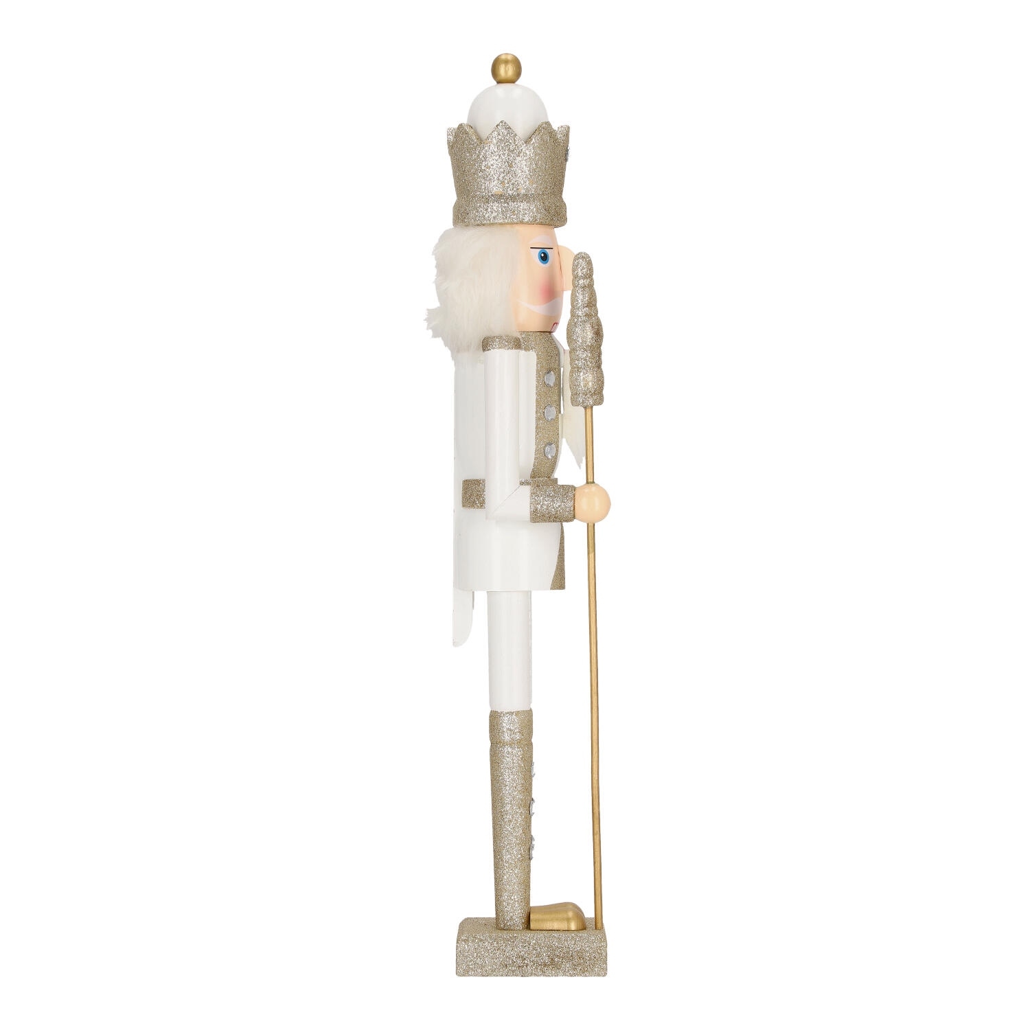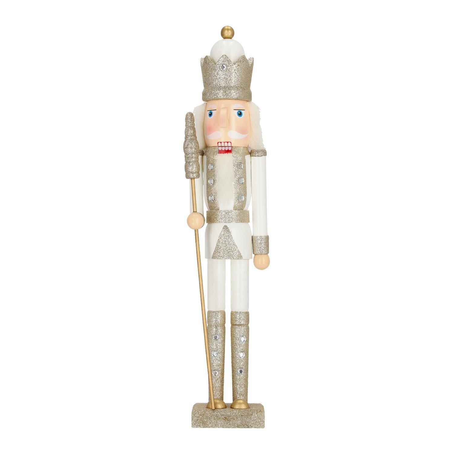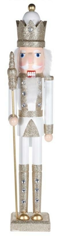 Dekoracja dziadek do orzechów w białym kolorze ze srebrnymi akcentami to hit każdych świąt bożego narodzenia. Sympatyczny żołnierz o puchatych białych włosach skradnie serce domowników. Biało srebrny dziadek do orzechów dopełni świąteczną aranżację. Duży, bo aż 55-centymetrowy, dziadek został zrobiony z drewna sosnowego pomalowanego w świąteczne wzory. Dziadek posiada kwadratową podstawkę, dzięki której stoi stabilnie, więc śmiało możemy nim ozdobić stół na świąteczny obiad lub kominek. Świąteczny dziadek do orzechów waży 850g.