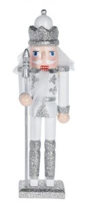 Dekoracja dziadek do orzechów w białym kolorze ze srebrnymi akcentami to hit każdych świąt bożego narodzenia. Sympatyczny żołnierz o puchatych białych włosach skradnie serce domowników. Biało srebrny dziadek do orzechów dopełni świąteczną aranżację. Wysoki, na 18-centymetrów, dziadek został zrobiony z drewna sosnowego pomalowanego w świąteczne wzory. Dziadek posiada kwadratową podstawkę, dzięki której stoi stabilnie, więc śmiało możemy nim ozdobić stół na świąteczny obiad lub kominek.