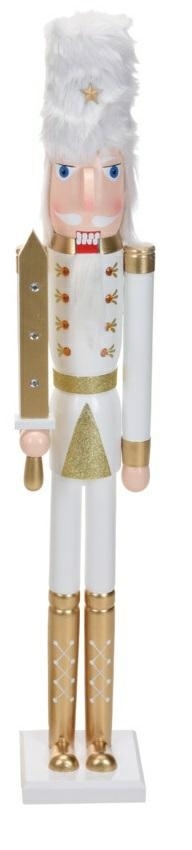 Olbrzymia dekoracja dziadek do orzechów w białym kolorze ze srebrnymi akcentami to hit każdych świąt bożego narodzenia. Sympatyczny żołnierz o puchatych białych włosach skradnie serce domowników. Złoto biały dziadek do orzechów dopełni świąteczną aranżację. Wysoki, na aż 106-centymetrów, dziadek został zrobiony z drewna sosnowego pomalowanego w świąteczne wzory. Dziadek posiada kwadratową podstawkę, dzięki której stoi stabilnie, więc śmiało możemy nim ozdobić stół na świąteczny obiad lub kominek. lbrzymi dziadek do orzechów waży ok.3kg i jest stabilną ozdobą, którą można postawić przy drzwiach wejściowych czy kominku.